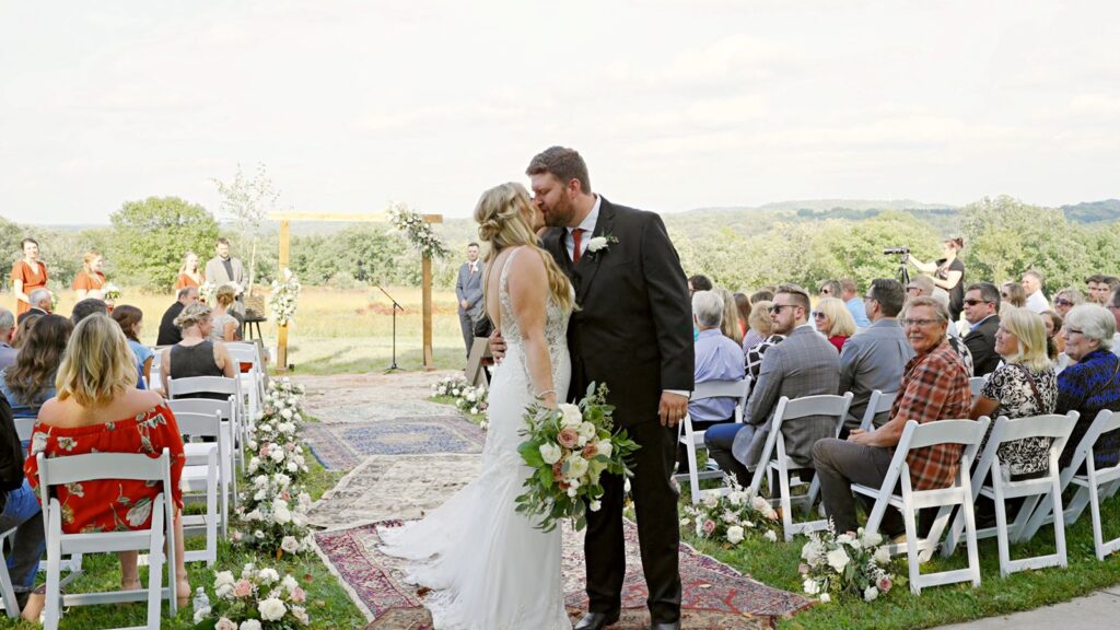 Their ceremony took place in one of the most picturesque spots at the Nature Center, surrounded by flowers and open fields. The aisle was lined with ornate rugs that added character and charm. When Rachel walked toward Landry beneath a flower filled arch, it felt like a moment made for film. Their vows were heartfelt and honest, the kind of words that carry even more meaning when you get to hear them again years from now.