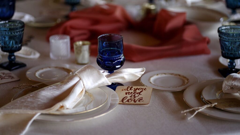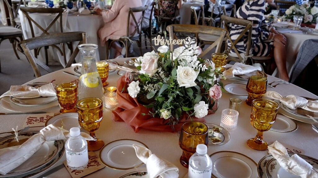 As evening arrived, the open air pavilion transformed into something magical. String lights glowed softly overhead. White draping framed the space and made it feel like everyone had stepped inside a secret garden. The vintage touches continued with delicate details that tied everything together.